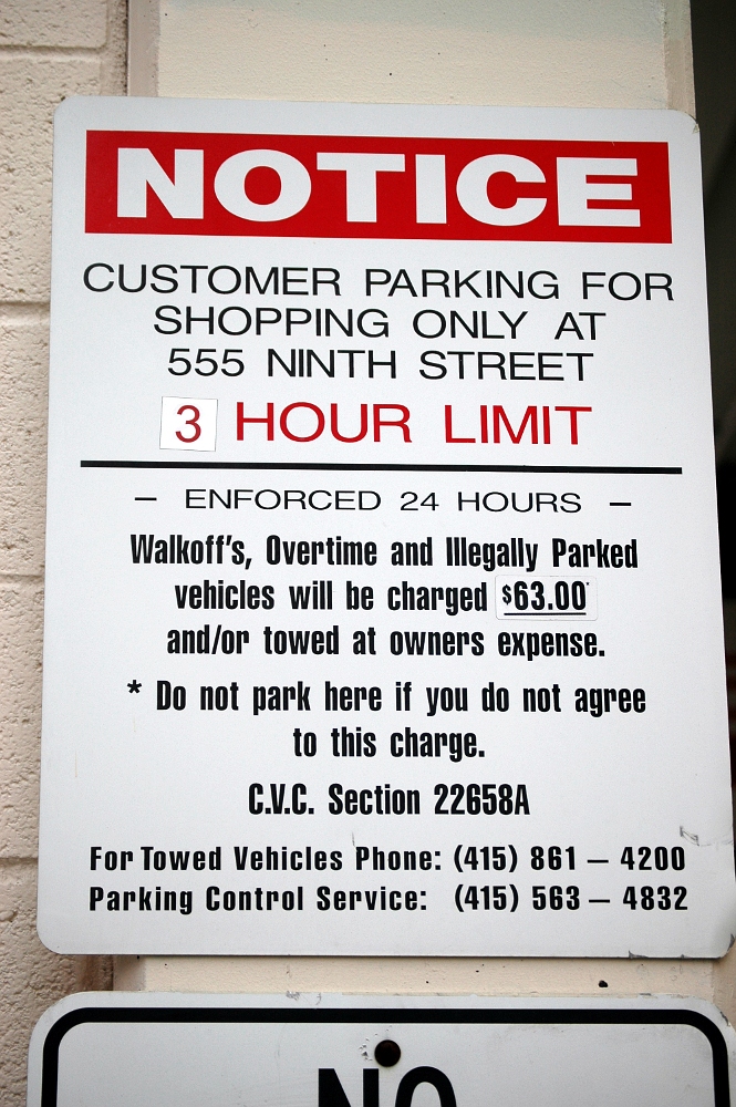 Oder wusstet ihr, dass ein Supermarkt erst nach einer Stunde den Abschlepper rufen darf, wenn jemand verbotenerweise auf dem Privatparkplatz parkt? Laut Parkparagraph 22953 des "California Vehicle Code" (CVC) muss der Supermarktparkplatzwächter erst eine Stunde warten, auch wenn er vor Wut platzt. Diese Regel eröffnet völlig neue Möglichkeiten des sogenannten "Walk-Off", einer Großstadttechnik, bei der man vor einem Laden parkt und sich dann von dannen schleicht, um irgendwo anders einzukaufen. Allerdings darf man nicht auf einem Behindertenparkplatz parken oder einen Hydranten blockieren, sonst kommt der Schlepper unverzüglich.