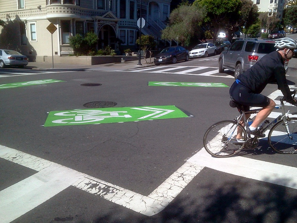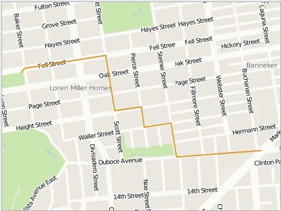 Wie ihr wisst, stehen in unserer Stadt teilweise gemeine Hügel im Weg, wenn man von einem Stadtteil zum anderen radeln möchte. Die Route schlängelt sich langsam von der Market Street im Zickzack durch die Viertel "Lower Haight" und "Panhandle", bis zum Golden Gate Park. Dabei bringt sie das Kunststück fertig, den Radlern zu keiner Zeit mehr als 6% Steigung abzuverlangen. Wer weiß, dass wir hier Straßen mit bis zu 30% Steigung haben, eventuell schon einmal versucht hat, diese im ersten Gang hochradeln und Angst hatte, hintüber zu kippen, weiß den Wiggle zu schätzen.
