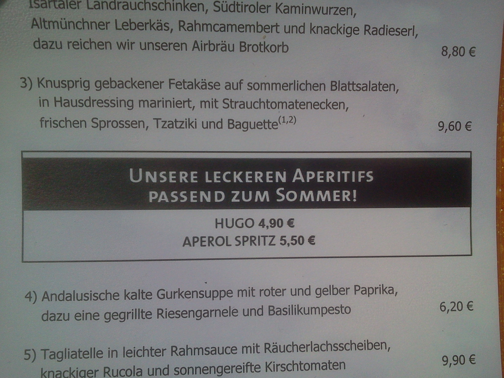 Angelika Wir besuchten Deutschland diesmal nicht wie sonst im tiefsten Winter, sondern im Juni, und das hatte den Vorzug, dass wir Biergärten besuchen und gemütlich in Straßencafes sitzen konnten. Dabei fiel uns sofort auf, dass erstaunlich viele Menschen ein orangefarbenes Getränk im Weinglas zu sich nahmen.