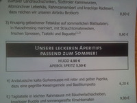 Allerdings, so unsere Freunde weiter, wäre der Aperol Spritz diesen Sommer längst ein alter Hut. Der sogenannte Hugo hätte ihm mittlerweile den Rang abgelaufen. Wir lernten, dass der Hugo aus Weißwein oder Prosecco, Eiswüfeln, Mineralwsser und Minzblättchen besteht, und natürlich darf die wichtigste Zutat, Holunderblütensirup, nicht fehlen. Da ich ein großer Prosecco-Fan bin, waren beide Getränke der Hit. Mittlerweile wird Prosecco auch in Amerika bekannter und beliebter, zumindest in unseren Gefielden. Da werden wir gleich bei unserer nächsten Party die importierten Renner aus Deutschland präsentieren.