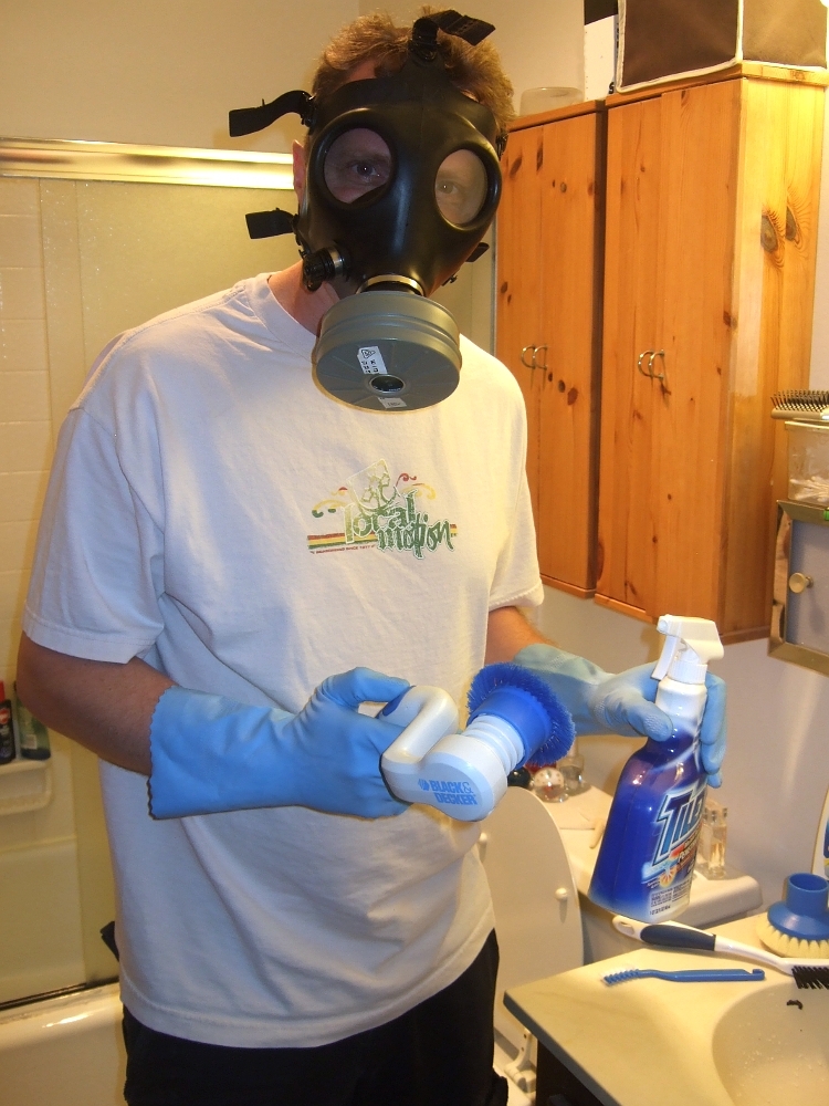 Dieser Gestank scheint wirklich ungesund zu sein, denn er verursacht bei mir rasendes Kopfweh, das stundenlang anhält. Deshalb kam ich erst auf die Idee, mir einen Mund- und Nasenschutz für Heimwerker umzuschnallen, aber als auch das nichts half, erinnerte ich mich an meine Bundeswehrzeit, und kaufte mir eine Gasmaske mit Giftgasfilter. Das Ding ist der Hit! Ich rieche nun beim Putzen überhaupt kein Chlor mehr und entsprechend bleibt auch mein Kopf klar. Die Maske gibts bei Amazon für nur 20 Dollar zu kaufen und stammt aus israelischen Militärüberschussbeständen. Auf dem Filter stand etwas auf Hebräisch, das ich nicht lesen konnte. Das Oberteil aus schwarzem Gummi trägt sich relativ bequem und verfügt sogar über einen Trinkschlauch, falls man Durst bekommt. Toppprodukt!