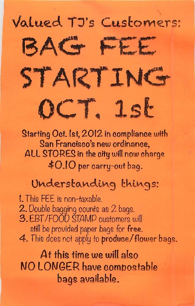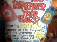 Angelika Seit ersten Oktober diesen Jahres sind an den Registrierkassen von Geschäften in San Francisco keinerlei Plastiktüten mehr erlaubt. Schon seit 2007 dürfen große Supermärkte und Drogerieketten die Waren der Kunden nicht mehr in Plastiktüten sondern nur noch in Papiertüten einpacken ( Rundbrief 04/2007). Ab sofort gilt das für alle Geschäfte in San Francisco. Nur Bäckereien und Restaurants sind noch bis 2013 ausgenommen. Hinzu kommt, dass Papiertragetüten seit ersten Oktober nur noch gegen einen Obulus von 10 Cent per Tüte ausgegeben werden. Will der Kunde die 10 Cent nicht zahlen, muss er seine eigenen Beutel und Stofftragetaschen mitbringen.
